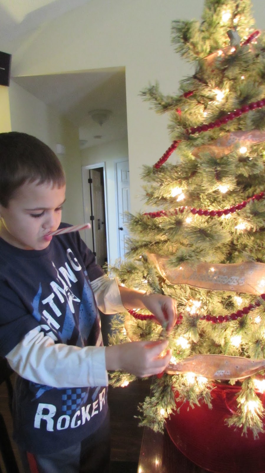 After Mom and Dad left, we warmed left-overs for dinner and then started to decorate for Christmas. I have scaled back enough I honestly believed this process would quick and painless. That was my mistake. After a few hours spent finding a broken bulb on a brand new pre-lit tree and a makeshift tree stand for said tree was created so it would fit inside the bucket I intended to use, I am happy with the results. The little tree is exactly what I hoped it would be. Ty says it is so pretty, Santa may take it back to the North Pole with him.